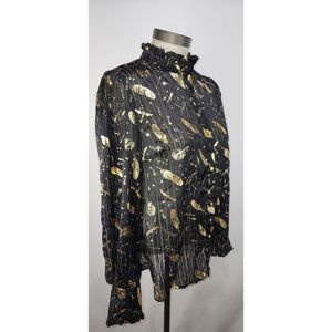 Harry Potter Women's Sheer Black Button-Up Blouse with Gold Feathers Size M. Shirt is made from sheer polyester. Although never or rarely worn, there is some slight peeling of gold at certain places on shirt. Mandarin collar neck with ruffles.