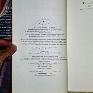 The product is a first edition hardcover copy of "Harry Potter and the Prisoner of Azkaban" by J.K. Rowling, published by Scholastic, Incorporated in 1999. This vintage book, part of the Harry Potter series, is illustrated by Mary Grandpré and features a dust jacket and is in good condition. With a narrative focused on fantasy and magic, this novel is intended for young adults and adults, making it a valuable addition to any collection for fans of the series or literature in general. Multiple books purchased in the same order will receive a 20% discount.