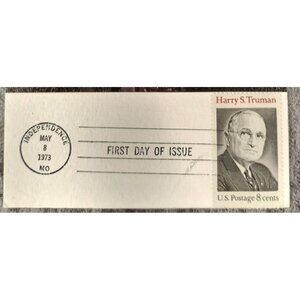 A vintage collectible featuring an official 1973 Harry S. Truman First Day Of Issue 8-cent stamp and a portrait card by John Slavin.
