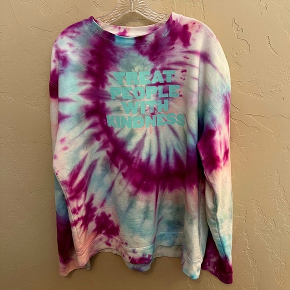 Description: Brightly colored tie dyed crewneck long-sleeve sweatshirt. Turquoise colored distressed block lettering "Treat People with Kindness"
