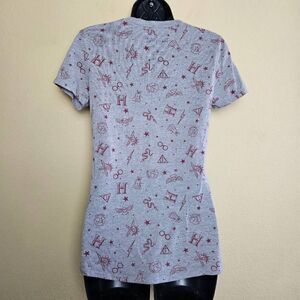 This is a short sleeved Harry Potter t-shirt. It is light grey and has images from the story in red. Note this shirt is longer in the back than in the front.