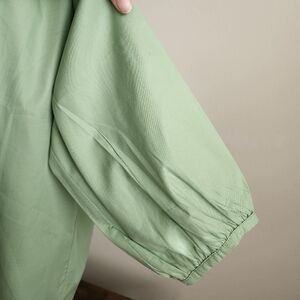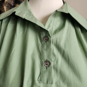 Double button V-neck close with balloon sleeves. Pleating at shoulders, rips back hem slightly longer than strath longer front hem. 100% cotton, oversized fit.