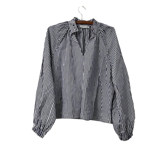 Harshman Los Angeles Womens Blue Striped Ruffle Collar Vneck Blouse Size Large