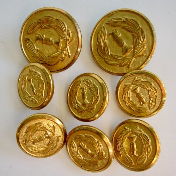 Gold tone metal buttons were made by Waterbury and feature a victorious laurel leaf design. Shank back. Two front buttons, six cuff.
