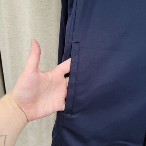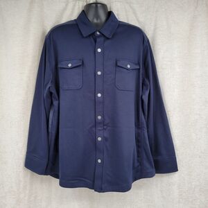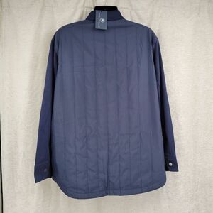 Dark blue shirt jacket with heavy duty snap closures, front is slick, back is quilted and lightly filled.