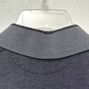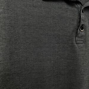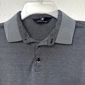 This is men's short sleeve polo shirt by Hart Schaffner Marx. This shirt is Navy blue and features a small white dot pattern. Shirt is collared.