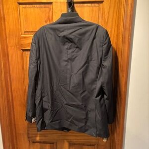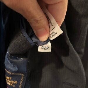 Hart Schaffner & Marx suit jacket in grayish blue. 100% worsted wool. 2 button closure. Men's size 42R. There is white threading along shoulders I assume for altering. New without tags.