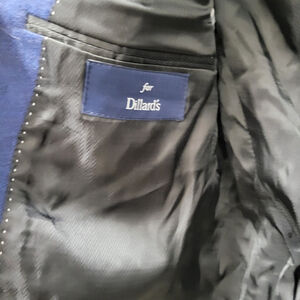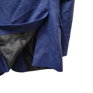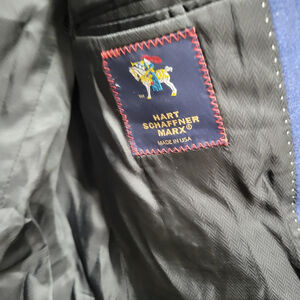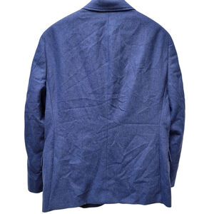 Hart Schaffner Marx Shawn Darst Wool Cashmere Blend Sport Coat Jacket in size 40R is a stylish and classic suit jacket designed for men. Made with a luxurious blend of cashmere and wool, this jacket is perfect for the winter, fall, and spring seasons. It features a notch lapel, four-button sleeve button style, and a double-vented back for added style and functionality. The jacket also includes inner pockets and a solid blue color, making it a versatile and sophisticated addition to any man's wardrobe. Made in the United States, this jacket exudes a sporty theme and is tailored for a regular fit.