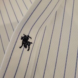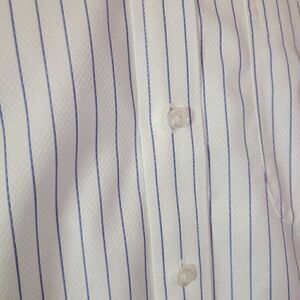 White color, blue stripes, spread collar, long sleeves with mitered buttoned cuffs, button-front closur, two back shoulder darts, cotton has a silky and lightweight feel. Shirt is in great condition.