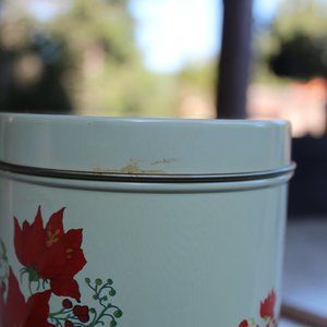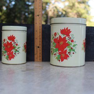 This is a awesome pair of early 1980s vintage holiday tins that have the normal vintage ware. Decorated with red poinsettias and winter green leaves. One tin is 6" and the other is 4 1/2" they nest inside each other. Perfect for a hostess gift or favorite person filled with something they love besides you . Please see photos.