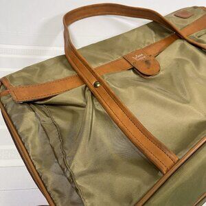 Designed to carry suits or dresses wrinkle-free, with interior straps, zip compartments, and sturdy leather handles.