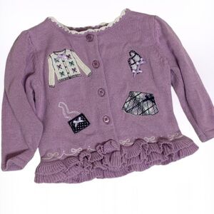 Matching lavender cardigan adorned with ruffles on the hem with embroidered bows across