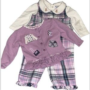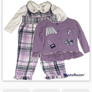Hartstrings Baby Lavender Plaid Overalls w/ Matching Onsie & Cardigan 3-6 months