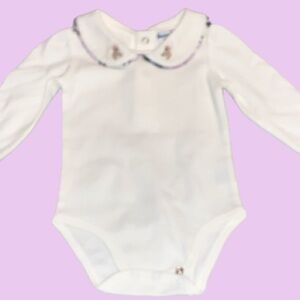 3 to 6 month white onesie, snap in back and snap crotch Embroidered teddy bears w/ pink bow lavender plaid piping on collar