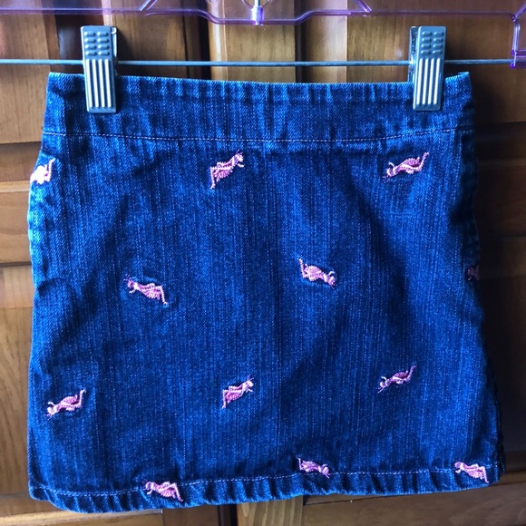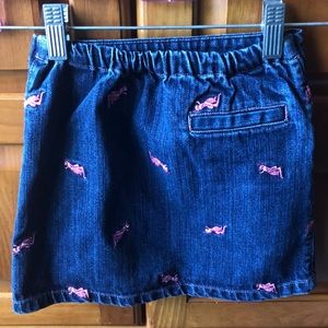 Denim skirt with embroidered pink grasshoppers. Skirt has pockets and elastic waist in the back.