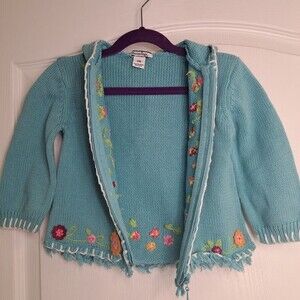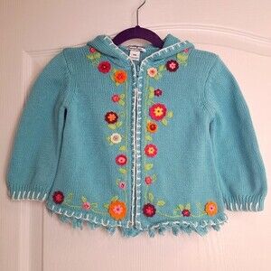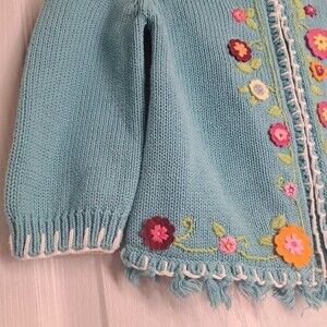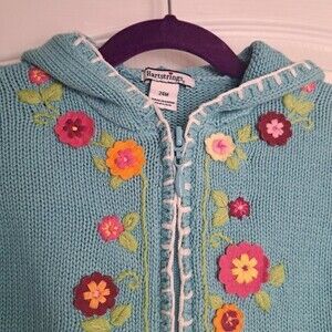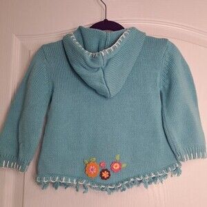 Amazing blue knit sweater cardigan with zip front and hood. Embroidered flowers colorfully adorn this precious sweater, fringe on lower hem. by Hartstrings. size 24 months
