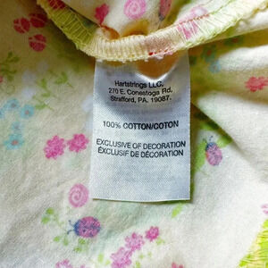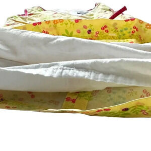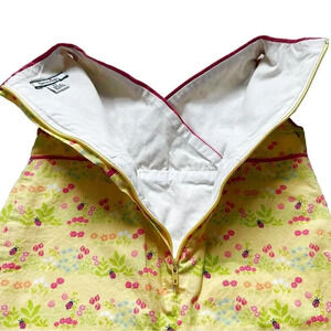 Sweet, sleeveless, faux wrap dress from Hartstrings. Pale yellow with floral pattern and contrasting pink trim; fully-lined; zipper closure at back.