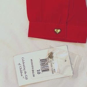 This long sleeve blouse is brand new with tags still attached. Comes in a beautiful red, features a small gold heart button on each cuff sleeve, and one on the back of the collar. Versatile to dress up or down, so cute