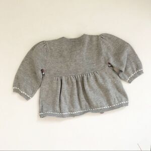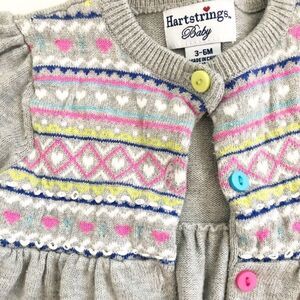 Adorable baby cardigan with colorful fair isle design of hearts and stitching. Size 3-6 months. Gray with pink, white, blue and chartreuse accents. Multi colored buttons.