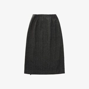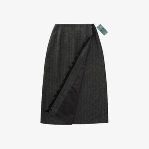 Absolutely stunning New with Tags (NWT) midi skirt by Harvé Benard! This piece features a sophisticated herringbone or tweed-like texture in a dark charcoal gray.