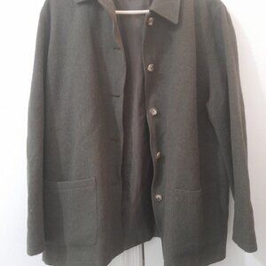Beautiful olive green wool with olive green lining. Five buttons; two deep square front pockets.