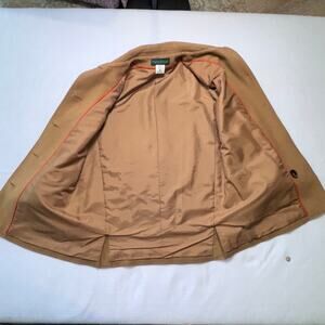 Vintage Harve Benard 100% wool coat in camel with snakeskin-print trim on collar and pockets. Large iridescent buttons, fully lined, double back vents. Extra inside button. Some minor wear consistent with age—excellent condition overall.