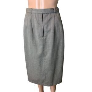 This Harvey Bernard collection vintage career skirt suit has a houndstooth pattern and is 100% wool. The pencilskirt has a unique wraparound belt, fly zippers, 10 inch kickpleat in the back, and is fully lined. The jacket has chest pocket, hip pockets, shoulder pads. Dry clean. The suit is suitable for career wear, academia, business appointments.