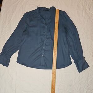 The Harve Benard Gray Long Sleeve Blouse with ruffled detail is a classic piece that exudes timeless elegance. Its vintage charm, combined with the sophisticated ruffles, makes it a versatile addition to any wardrobe. The blouse's size large ensures a comfortable fit, while the gray color offers a neutral palette that pairs well with a variety of colors and patterns. Whether dressed up for a formal event or styled casually for a day out, this blouse is sure to make a statement.