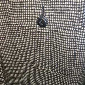 Checked tweed wool long length fully lined , 3 button 3 pocket with suede patch and hook closure at neck