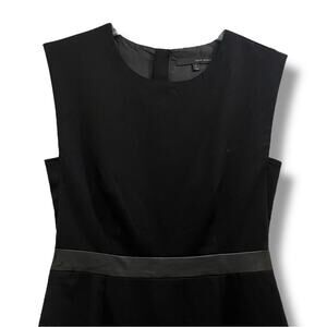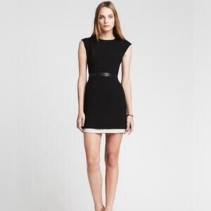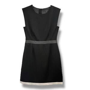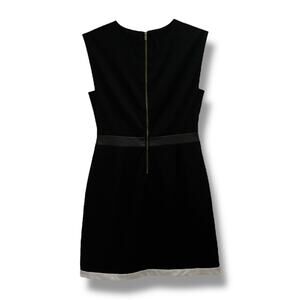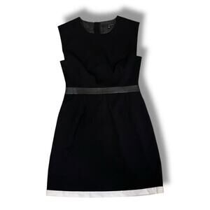 Harve’ Benard sleeveless Little Black Dress with faux leather waist trim and white stripe hem in a structured mini shift dress featuring vegan leather accents and on-trend colorblock details. Faux belted waist adds definition and accentuates the slimmest part of your midsection for a universally flattering look. Exposed back zipper and contrasting white border trim at hemline turn up the heat.