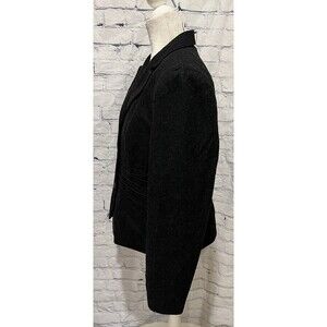 This Harve Bernard blazer jacket is a professional and stylish workwear option for the winter season. Made from wool with a solid gray color, it features long sleeves, a short length, and a zip closure for easy wear. The plus size 16 fit is designed for women, and the wool blend lining provides added comfort and warmth. Perfect for the colder months, this blazer jacket from the harvé benard brand combines practicality with a sophisticated style, making it a versatile addition to any winter wardrobe. 21 inches pit to pit and 23 inches long. Smoke free home.