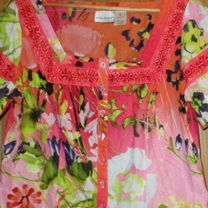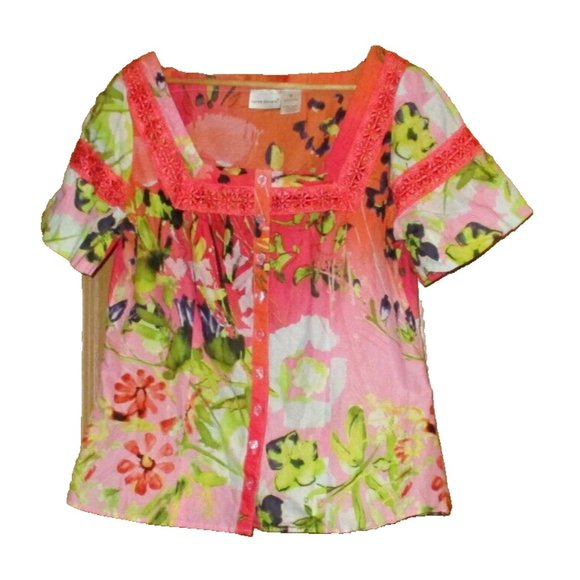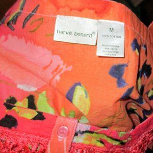 Harve Bernard Floral Peasant Blouse Cotton Top Button Front Shirt M Short Sleeve