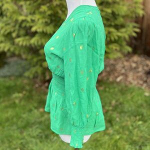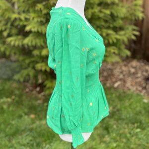 Chic and lightweight Harve Bernard blouse in a rich palm green with subtle gold foil detailing. Designed with a flattering V-neckline and soft smocking at the waist and wrists, this top features feminine balloon sleeves and an easy, comfortable fit. Perfect for holidays, festive events, or elevated everyday wear.