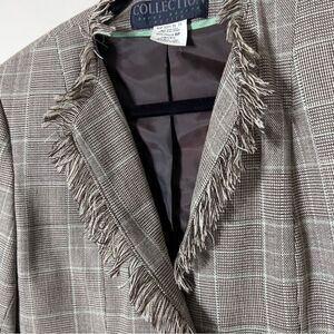 Harve Bernard Wool Blend Brown Plaid Fringe Detail Blazer Jacket. Size 8 Petite. Brown, White, light mint green. Fringe trim throughout. One button closure. Two patch front pockets. 98% Wool 2% Spandex. Very Sharp. Excellent used condition.