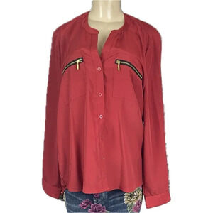 Harve Bernard XL Tomato Red Button Split Neckline Zip Pockets Long Sleeve Blouse