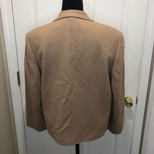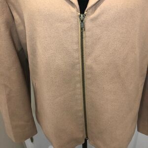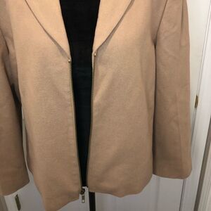 Harve Bernard by Bernard Haltzman zip front tan camel blazer. Pockets for style, great condition. Size tag missing, worn as medium. Sleeve 21in, pit to pit 17in, length 23in. Sleeve does not meet at wrist.