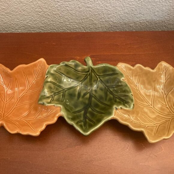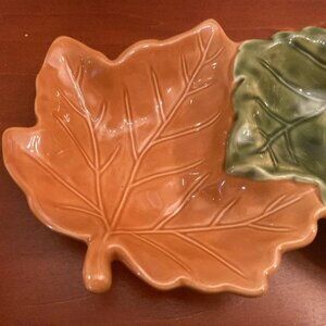 Cute 3 leaf fall themed 'condiment' / serving dish. It is dishwasher & microwave safe. Approx. 14" long x 6" wide and right at 1 1/2" deep. We also have the matching serving/baking dish, so be sure to check that out and create a bundle ! Just search the word FALL in the search bar to find it.