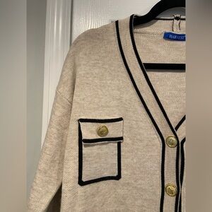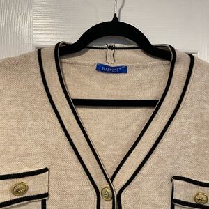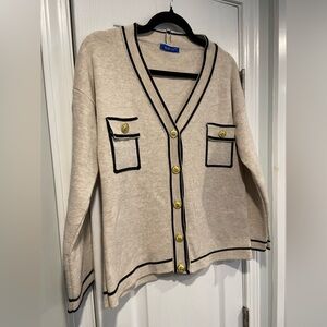 Harvest Size L Oatmeal Long Sleeve V Neck Gold Button Front Cardigan Black Trim