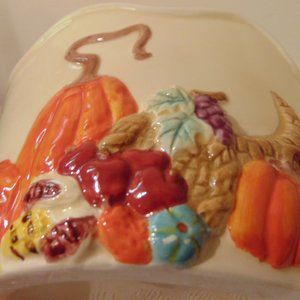 It's harvest time. This ceramic container features pumpkins, gourds, grapes and apples as well as cornucopias. It has an ivory background and lots of colorful fruits. It has a shiny glazed finish.