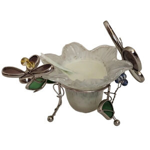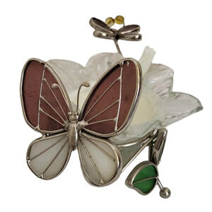 Harvested Mugwort Coconut Oil Stained Glass Butterfly & Flower Tealight Candle Holder Scrolling Silver Metal