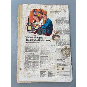 Spine damage with tears. Water stains on pages. Cover shows large creases with edge wear. Interior pages intact but delicate.