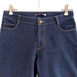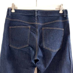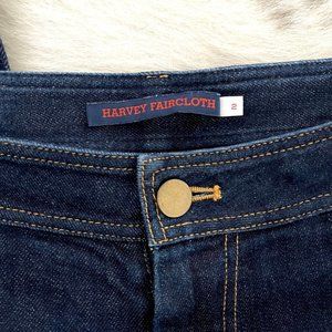 These lightweight cropped jeans from Harvey Faircloth are perfect for warmer weather. Mid rise 5-pocket style in dark blue with contrast stitching. The cropped style has a slight flare at the bottom. These jeans are labeled a size 2, but since they run a little big I’ve listed them as a size 4 (see measurements below). Worn a few times and in excellent condition with no stains or tears.