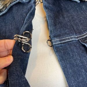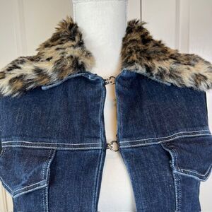 Harvey Faircloth Faux Fur Leopard Collar Denim Vest Green Lining Size Medium. Excellent condition. See photos for details. Soft, light denim - not stiff. Fun oversized hook and eye closures on front. Detachable fur collar. A plush leopard print collar lends luxe richness to this stylish HARVEY FAIRCLOTH denim vest. (98% cotton 2% elastic). Vest. Sleeveless. Hook-and-eye closure on chest. Fully lined. Front pockets. Contrasting seam stitching. great for date night, club, night out , party, fall, winter, conversation piece, attention getter