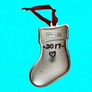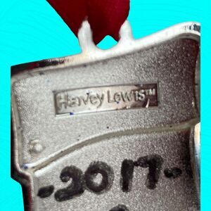 Harvey Lewis red sparkle and silver stocking Christmas ornament with a silver letter "C" on the front and a red Swarovski crystal. The stocking is red with a silver cuff. The back is signed Harvey Lewis.