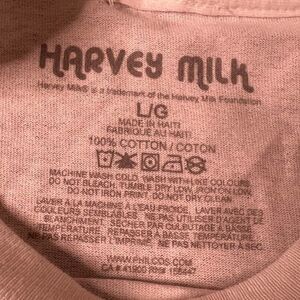 This listing is for a NWT Harvey milk, T-shirt in size large. The LGBTQ icon is featured on the front of the shirt, the short sleeve T-shirt is white.