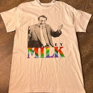 This listing is for a NWT Harvey milk, T-shirt in size medium. The LGBTQ icon is featured on the front of the shirt, the short sleeve T-shirt is white.