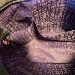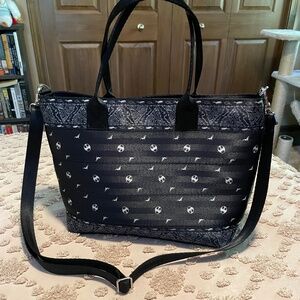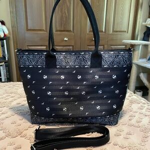 Previously used Harvey’s mini streamline tote in Jack Skellington Bandana pattern in good, clean condition. Interior is a deep purple Harvey’s print with one zippered pocket and two open pockets. Tote zips to keep everything inside. Comes with a shoulder strap never used. Also comes with the never used, new condition bandana that came with the tote.