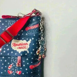 American Made Harveys adjustable strap and pop of color Scarlet zip top. Comes fully lined with red monogram liner with an interior zip pocket and extra slip pockets for organization. Adorned with a red, white, and blue Charm of HARVEYS loveable Cali Bear.