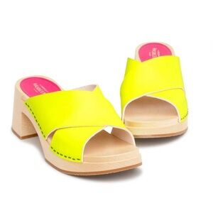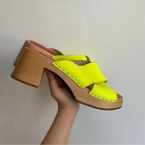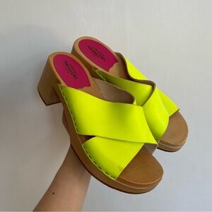 Hasbeens Anette High Neon Yellow Slip On Heeled Sandal Wood Block Strappy 39