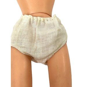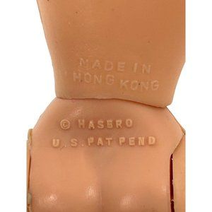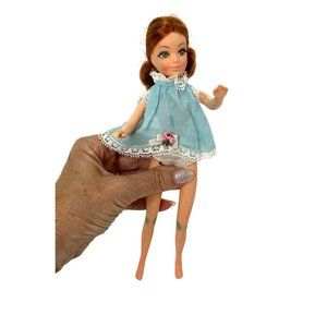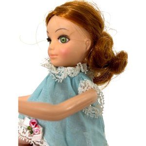 0825A- Hasbro 1970s The World of Love & Peace Fashion Doll Girl, 9.5” tall, 3” wide, 2” deep. Red hair, parted in middle, tied back with rubber band, long hair, with curls on the bottom. Green eyes, with real brown eyelashes, brown eyeshadow and eyebrows, thin eyebrows, pink cheeks. Wears baby doll top, light, blue, with lace, trim at collar, arm, opening, and him, snap closure in the back, open at the back. Has rose, buds and bow detail on the front bottom him, has gauze white underwear with elastic waist. Arms and torso are plastic. In the back it says made in Hong Kong, Hasbro, US, Pat pend. Legs are rubber and bend at the knees, there is dark discoloration at the knees. There are reddish stains on the lower legs and feet. Lovingly preowned. Good condition.